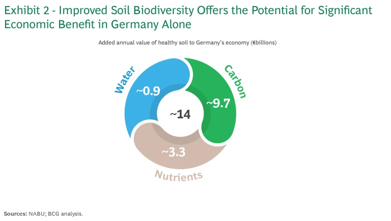 At that point, the economic gains would be considerable. (See Exhibit 2.) The carbon gains alone would total close to €10 billion. This includes €9.6 billion from enhanced carbon capture in soil , which would reduce the country’s CO2 emissions by about 43 million tons. That’s comparable to eliminating the CO2 emissions from around 18 million cars, or about a third of all of Germany’s cars. An additional €0.1 billion would be gained from decreased CO2 emissions due to reduced fertilizer use. Moreover, because the production of nitrogen fertilizer accounts for around 2% of global CO2 emissions, every reduction in fertilizer use helps lower those total emissions.